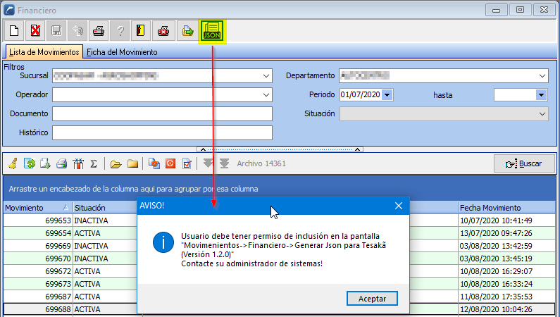 "Usuario debe tener permiso de inclusión en la pantalla "Movimientos->Financiero->Generar Json para Tesaka (Versión 1.2.0)" Contacte su administrador de sistemas!".