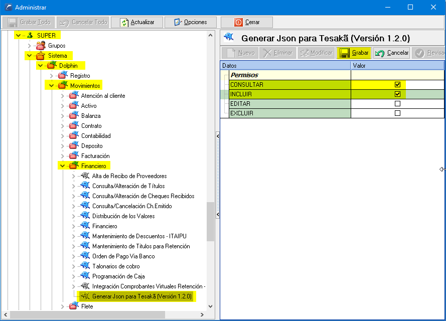 - Despliegue el menú "Usuarios", seleccione el usuario que debe generar el archivo JSON, ubique y seleccione la pantalla "Generar Json para Tesaka (versión 1.2.0)" (Sistema > Dolphin > Movimientos > Financiero > Generar Json para Teska (Versión 1.2.0)), marque las casillas: CONSULTAR e INCLUIR, finalmente haga clic en "Grabar" y "Grabar Todo";