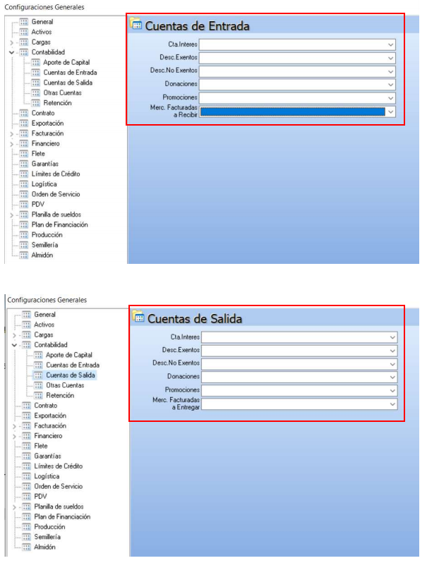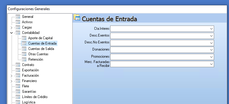 - Merc. Facturadas a Recibir: El sistema utiliza como cuenta puente en el momento de realizar una factura de COMPRA con proceso Totalizadora en el módulo Facturación (este tipo de proceso es cuando ya se necesita facturar sin embargo aún no se tiene en stock la mercadería, por lo que al momento de realizar la recepción esta cuenta quedará cero y asumirá la cuenta de existencia de la mercadería)