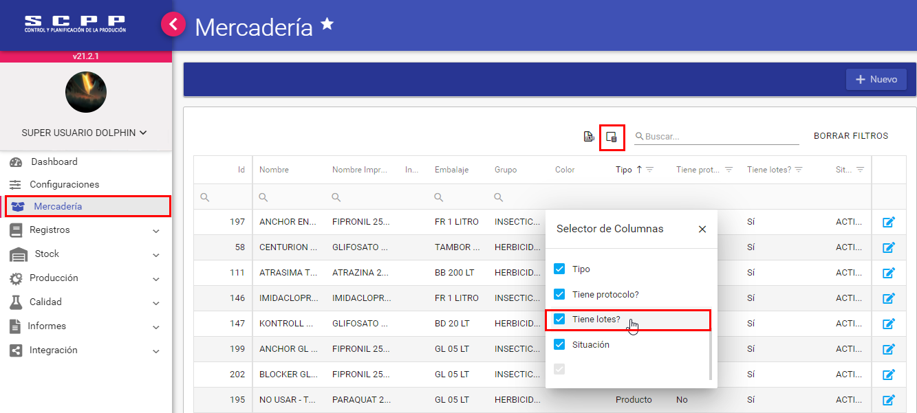 Seleccione: "Mercadería" a continuación el icono de "Selector de Columnas" en la que aparece la opción de visualizar las columnas en la lista de mercaderías; habilitar la opción "Tiene lotes?" y ya puede visualizar: