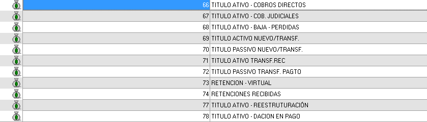 Estas operaciones son utilizadas para bajar títulos Activos o Pasivos respectivamente, las cuales fueron transferidas a otra cuenta, posee la misma funcionalidad que la Op 11 Cuenta Ativa - Cobros y Op 12 Cuenta Pasiva - Pagos, se utilizan normalmente como contrapartida de las operaciones mencionadas anteriormente que sería la Op. 69 Titulo Activo - Nuevo/Transf.