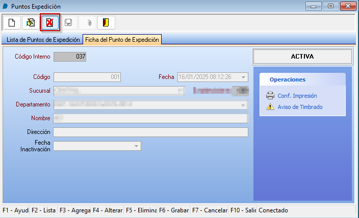 Al tener inactivo el punto de expedición, se procede a inactivar el registro de timbrado