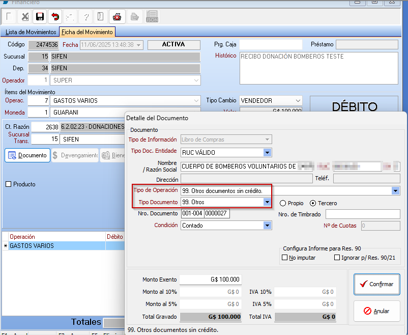 En el caso de los recibos de donaciones especiales, al tratarse de egresos respaldados por documentos sin timbrados, su registro debe realizarse utilizando el tipo de documento "Otros". Esto permite evitar que la operación sea trasladada al libro de compras.