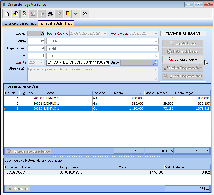 2. Dirigirse a Movimientos → Financiero → Orden de Pago Vía Banco, crear un nuevo registro con los datos de la orden de pago a ser aplicado y buscar las programaciones registradas anteriormente.